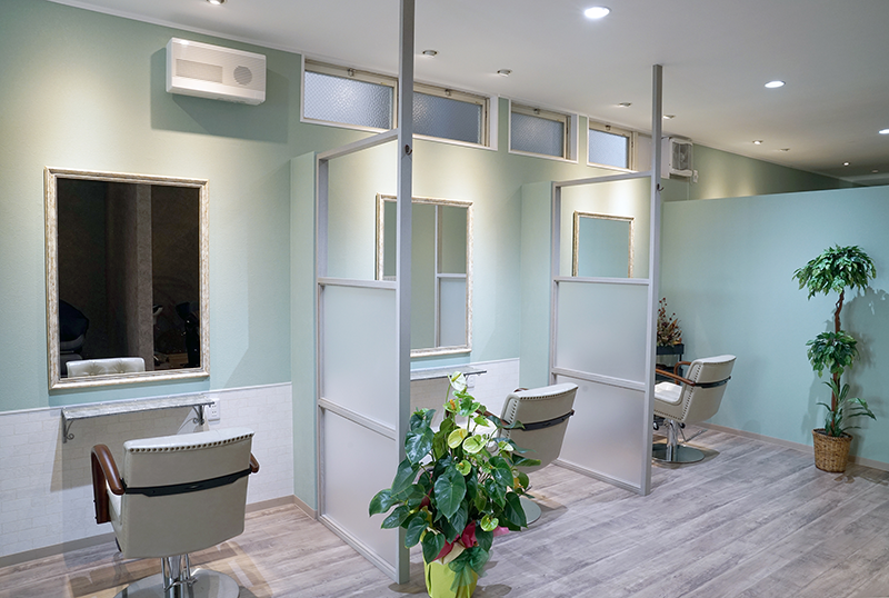 新型コロナ対策として各ブースを十分なスペースと仕切りを設けソーシャルディスタンスをとり、高機能換気設備の導入や開閉窓を設けて換気対策を行いました。